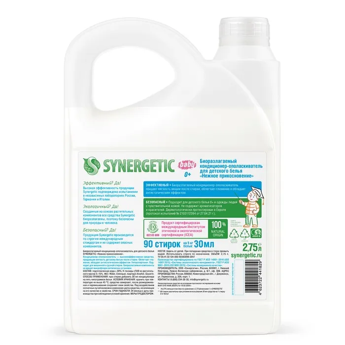 Биоразлагаемый кондиционер-ополаскиватель для детского белья SYNERGETIC Нежное прикосновение"– высокоэффективное средство, бережно ухаживающее за всеми типами ткани, в том числе деликатными, и придающее особую мягкость и нежность белью после стирки.