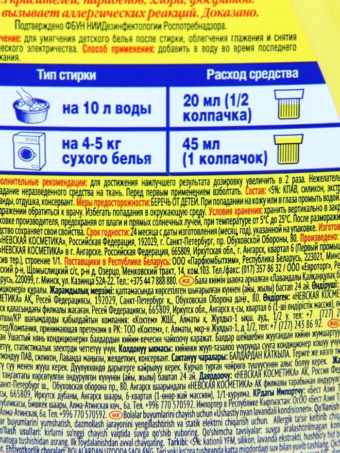 Кондиционер «Ушастый нянь» с лавандой делает бельё после стирки мягким, облегчает глажку и снимает статическое электричество. Средство подходит для обработки вещей детей любого возраста, в том числе новорождённых, и людей, склонных к аллергическим реакциям.