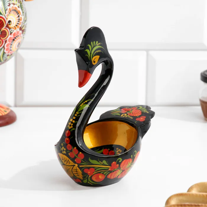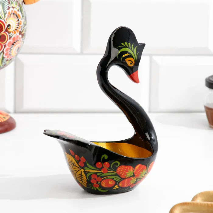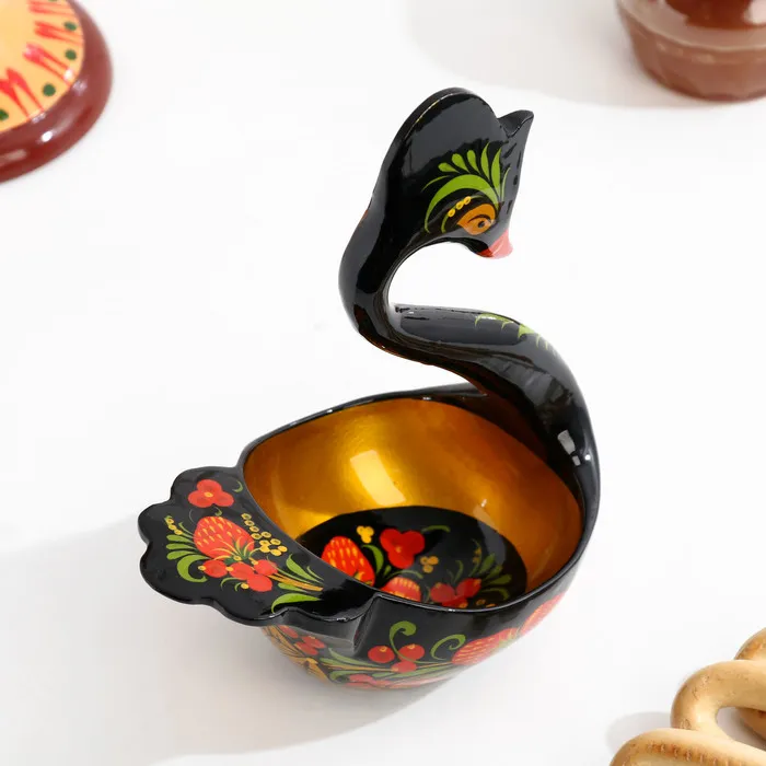 Традиционные элементы Хохломы — ягоды рябины и земляники, цветы и листья, птицы, рыбы и звери.