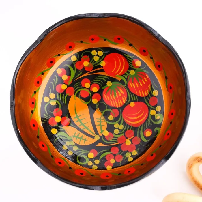 Традиционные элементы Хохломы — ягоды рябины и земляники, цветы и листья, птицы, рыбы и звери.
