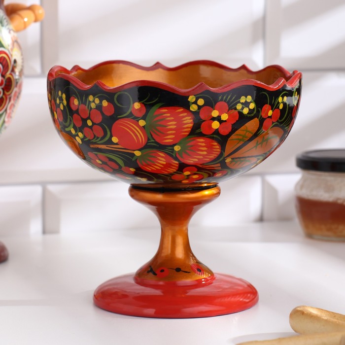Конфетница на ножке «Земляничка», резная, дерево, хохлома