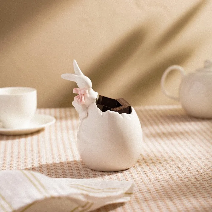Благодаря фигурной форме и милому изображению кроликов, изделие станет идеальным выбором для хранения сладостей, орехов или даже мелких фруктов. Белый цвет и гладкая текстура придают конфетнице универсальность, позволяя ей гармонично вписаться в любой интерьер.