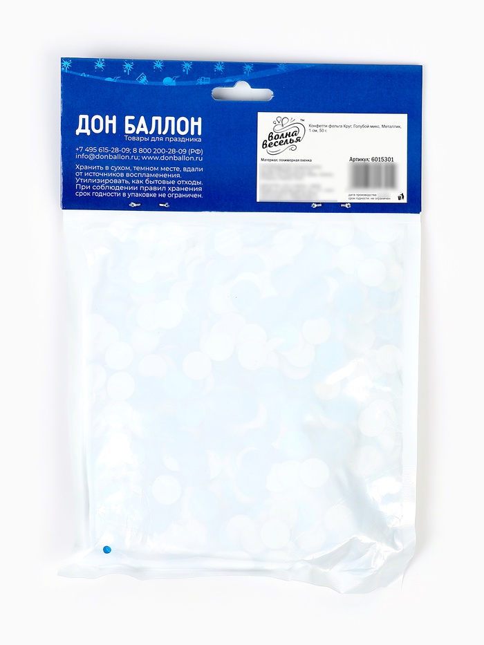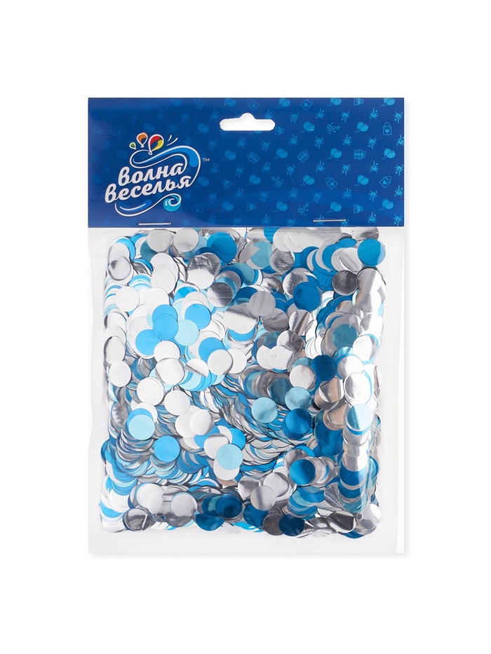 Голубой микс конфетти в форме кругов. В одной упаковке — два оттенка единого настроения: глубокий лазурный и холодный серебристый. Они не конфликтуют, а дополняют: один — как вода, другой — как отражение звёзд. Такой наполнитель подходит для композиций, где важна свежесть с достоинством.