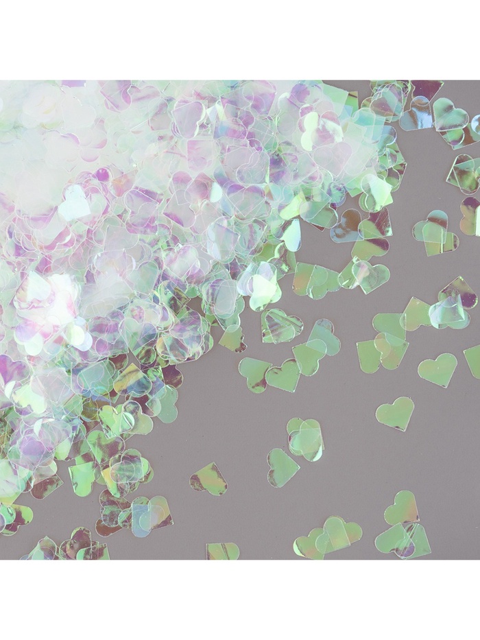 Перламутровое конфетти в форме сердец с эффектом хамелеона — как ”рассыпанные капли росы на паутине в первый весенний рассвет“. Кажется почти прозрачным — но стоит изменить угол зрения или освещение, и на гранях вспыхивают переливы: нежно-розовый, лавандовый, золотистый, сиреневый. Это не цвет, а *реакция на свет* — каждый элемент живёт своей жизнью, подстраиваясь под окружение. Такой наполнитель подходит там, где важна тонкая эмоциональная настройка без прямых символов.