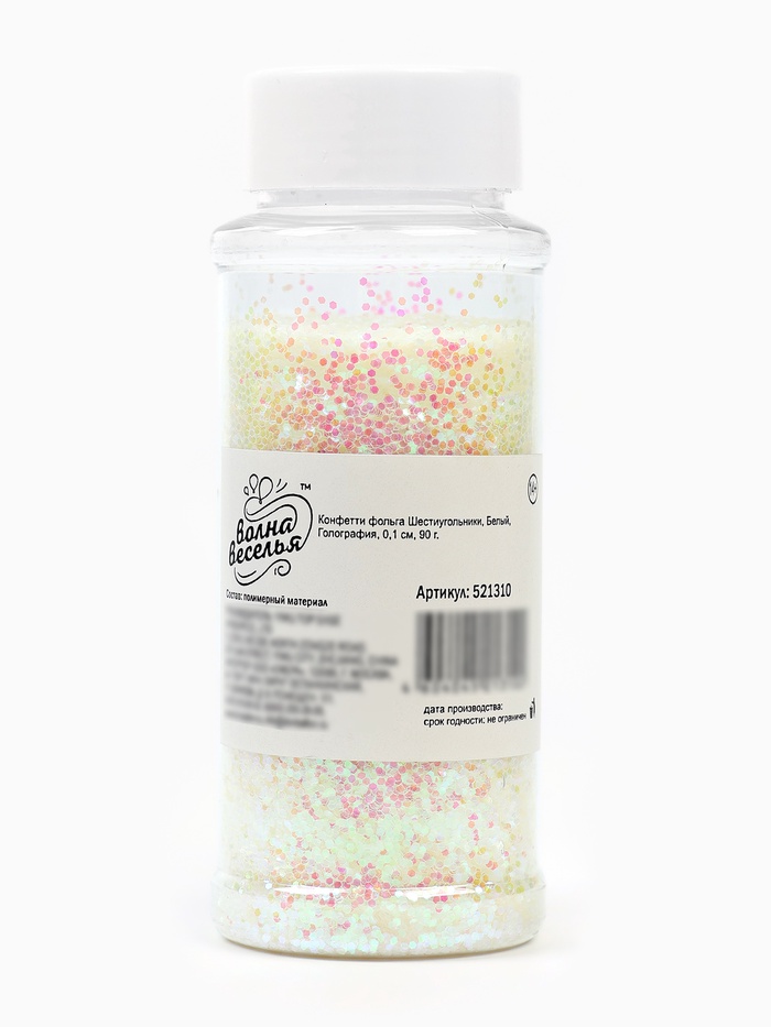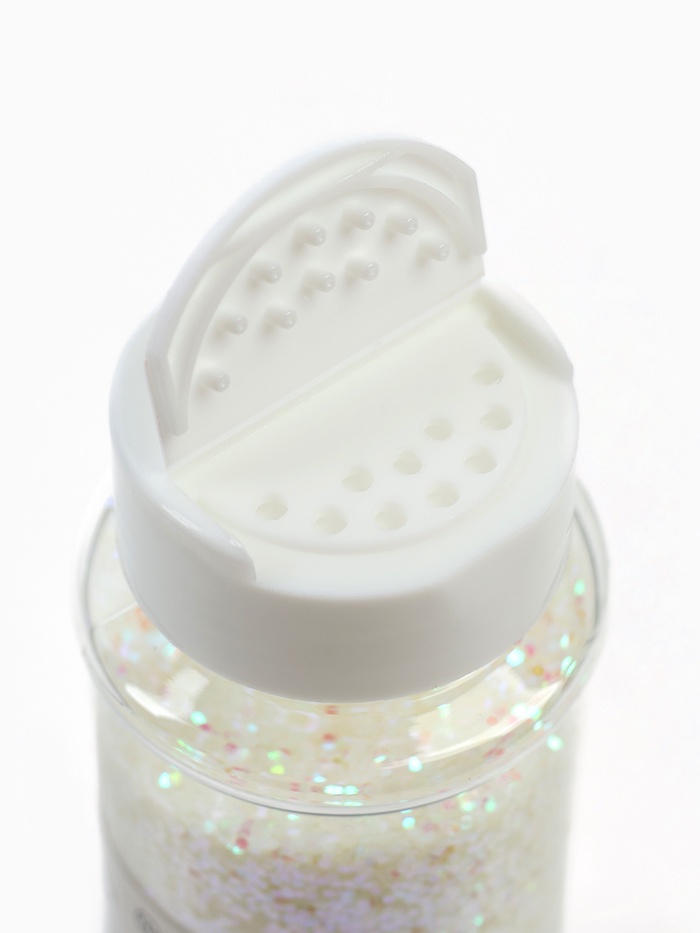 Белое голографическое конфетти в форме шестиугольников — как ”рассыпанный иней под утренним солнцем в январский полдень“. Кажется белым — но при малейшем повороте оживает: вспыхивает синим, розовым, золотым. Это не просто наполнитель — это световая текстура, которая превращает любой объект в носитель движения и глубины.