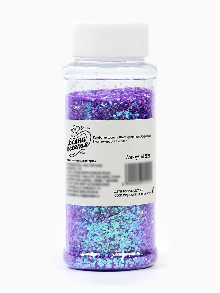 Сиреневое перламутровое конфетти в форме шестиугольников — как ”рассыпанная пыльца лавандового поля в утреннем тумане“. Его оттенок — не яркий, а глубокий: с лёгкой прохладой, но без стерильности, с нотой нежности, но без инфантильности. Форма шестиугольника добавляет структуру — в отличие от круга или звезды, она создаёт ощущение упорядоченной гармонии, как пчелиные соты или кристаллическая решётка. Такой наполнитель подходит для мероприятий, где важна атмосфера умиротворённого волшебства.