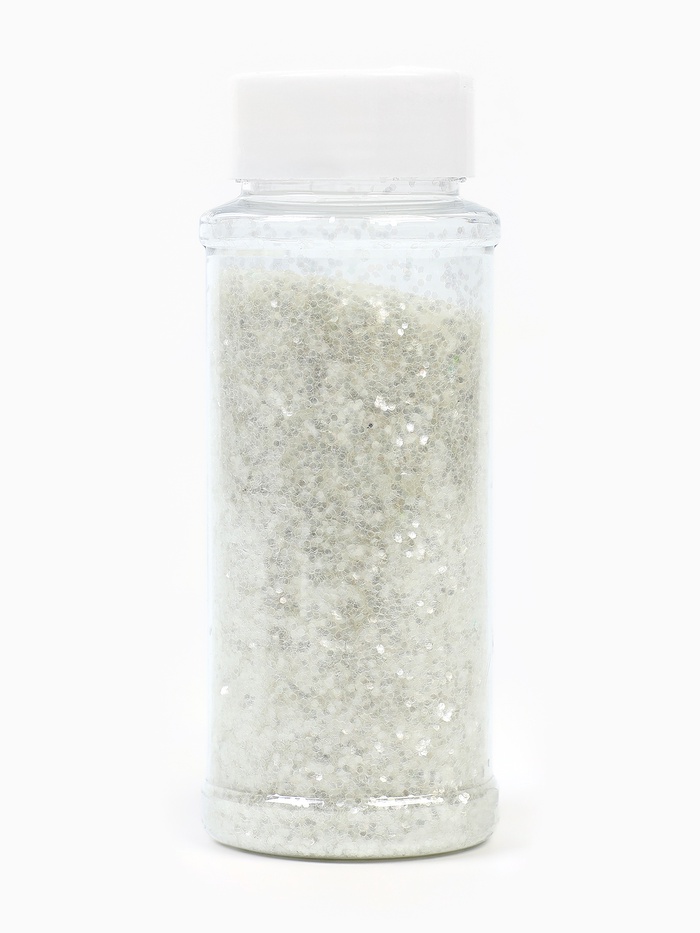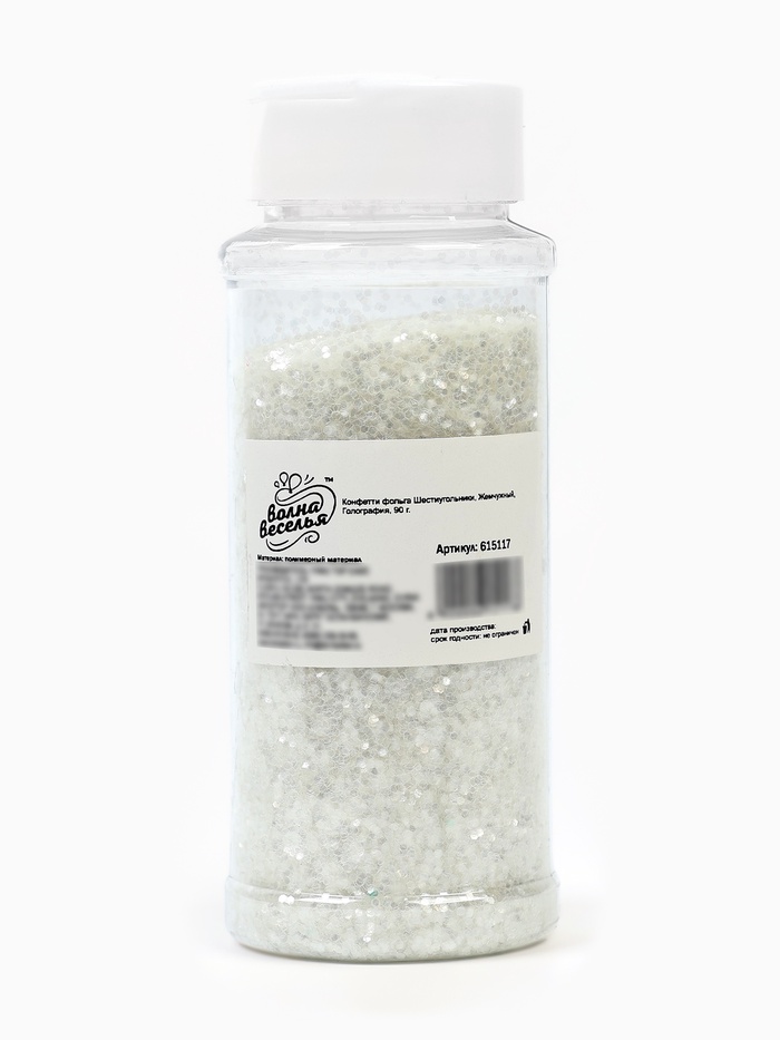 Жемчужное голографическое конфетти в форме шестиугольников — как ”рассыпанный свет, отражённый от поверхности морской пены в полдень“. Его основа — тёплый белый с перламутровым отливом, но при малейшем движении или смене освещения на грани вспыхивают искры: розоватые, золотистые, синеватые — как отблески на жемчужине в ладони. Такой наполнитель не украшает — он *оживляет*: добавляет глубину прозрачным объектам, превращает статичную упаковку в динамичную композицию, а лизун — в игрушку с внутренним сиянием.
