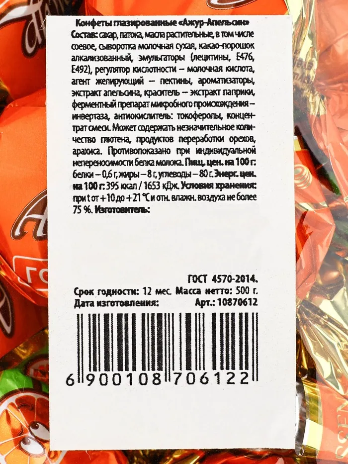 Состав: Сахар, патока, масла растительные, в том числе соевое, сыворотка молочная сухая, какао-порошок алкализованный, эмульгаторы (лецитины, Е476, Е492), регулятор кислотности молочная кислота, агент желирующий пектины, ароматизаторы, экстракт апельсина, краситель экстракт паприки, ферментный препарат микробного происхождения инвертаза, антиокислитель: токоферолы, концентрат смеси.