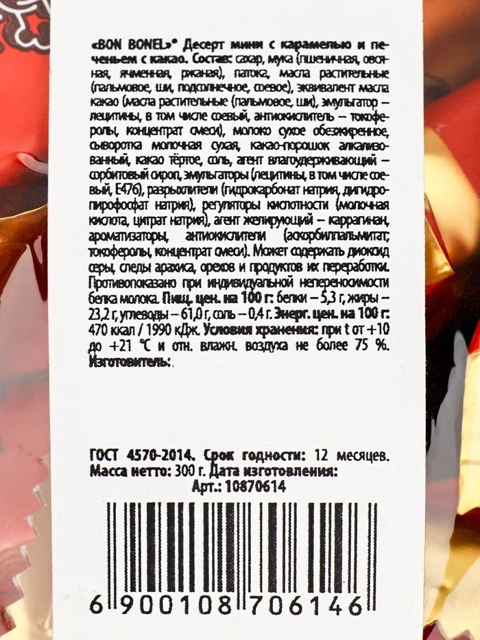 Состав: сахар, масла растительные, в том числе соевое, мука пшеничная, патока, молоко сухое обезжиренное, какао тертое, сыворотка молочная сухая, какао-бобы обжареные дробленые, какао-порошок алкализованный, продукт экструдированных круп и зернового сырья «Кранчи» (крупа рисовая, сахар, глюкоза, молоко сухое обезжиренное, масло пальмовое, соль, разрыхлитель гидрокарбонат натрия, эмульгатор лецитин соевый), хлопья овсяные, хлопья пшеничные, хлопья ржаные, хлопья ячменные, соль, агент влагоудерживающий глицерин, эмульгаторы (лецитин соевый, Е476, Е492), разрыхлители (гидрокарбонат аммония, гидрокарбонат натрия), регуляторы кислотности (гидрокарбонат натрия, молочная кислота), агент желирующий пектины, ароматизаторы, антиокислители (аскорбилпальмитат; токоферолы, концентрат смеси).