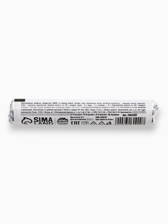 Состав: сахар, крахмальная патока, регулятор кислотности - лимонная кислота, краситель: Е160а - каротины, ароматизатор.