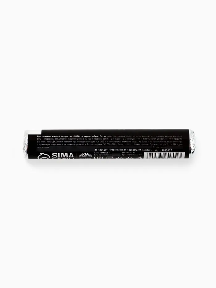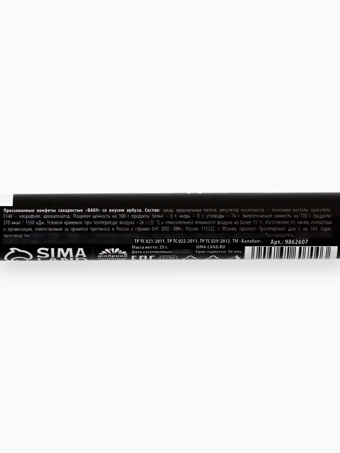 Состав: сахар, крахмальная патока, регулятор кислотности - лимонная кислота, краситель: Е140 - хлорофилл, ароматизатор.