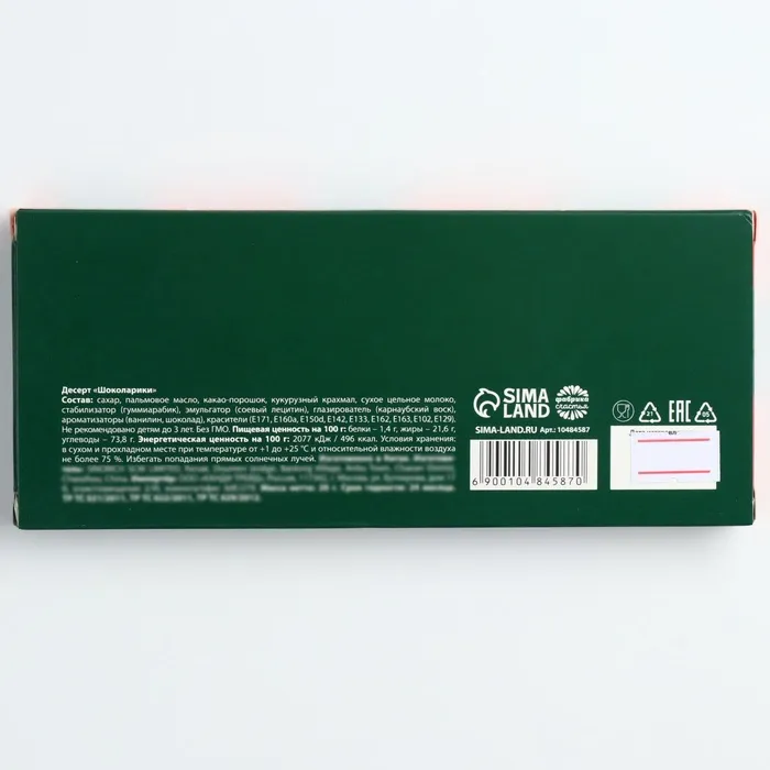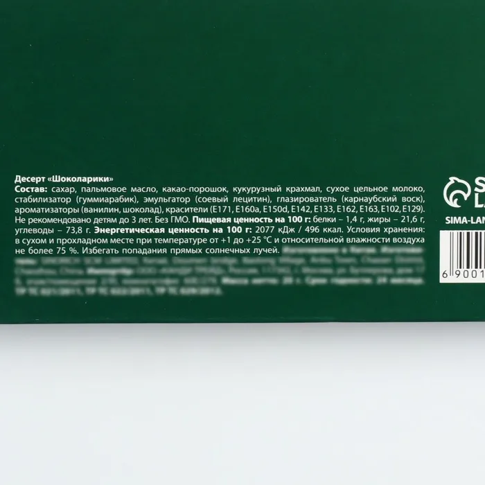 Состав: сахар, масло пальмовое гидрогенизированное частично, какао-порошок (2,3%), сыворотка молочная суха, крахмал кукурузный, загуститель Е414, эмульгатор Е322, ароматизаторы: "Ваниль", "Шоколад", глазирователь Е903, красители: Е171, Е160а, Е150d, Е142, Е133, Е162, Е163, Е129, Е102.