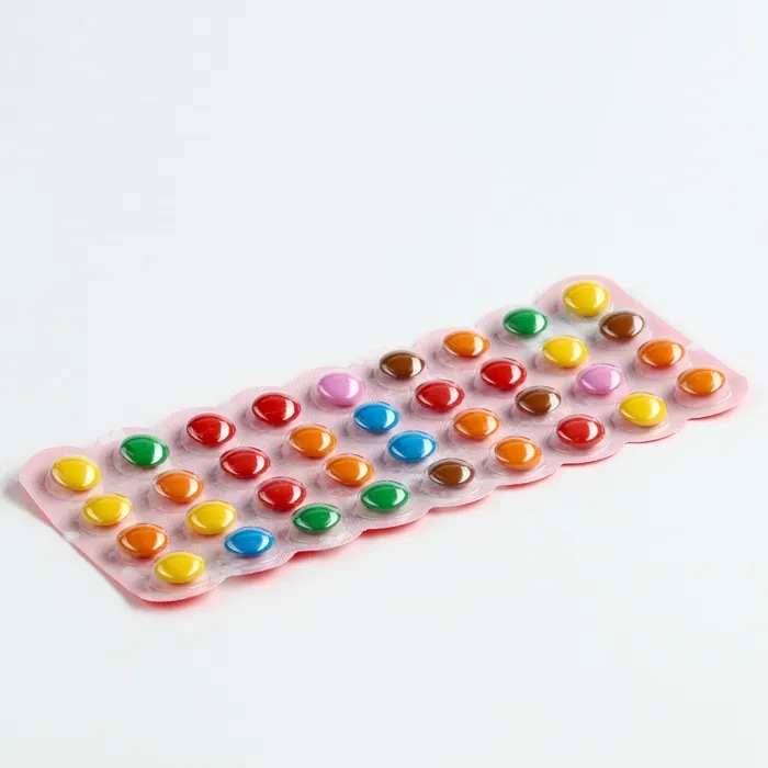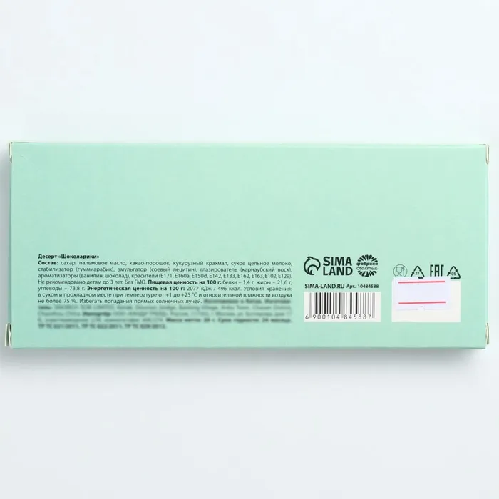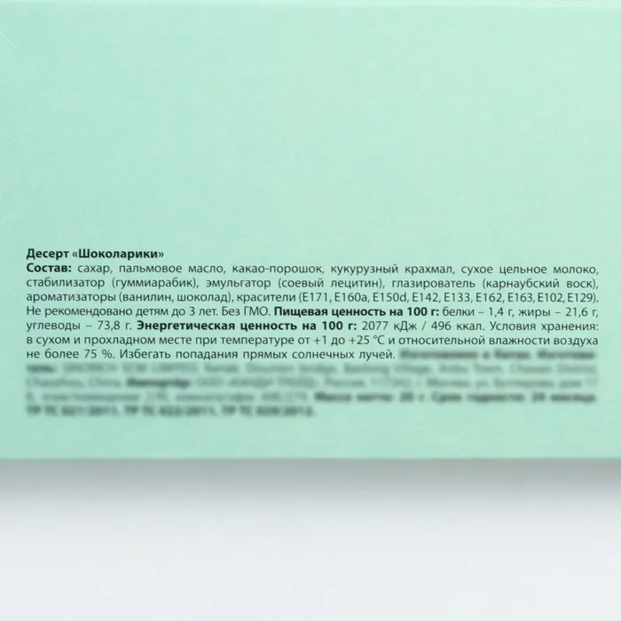 Состав: сахар, масло пальмовое гидрогенизированное частично, какао-порошок (2,3%), сыворотка молочная суха, крахмал кукурузный, загуститель Е414, эмульгатор Е322, ароматизаторы: "Ваниль", "Шоколад", глазирователь Е903, красители: Е171, Е160а, Е150d, Е142, Е133, Е162, Е163, Е129, Е102.