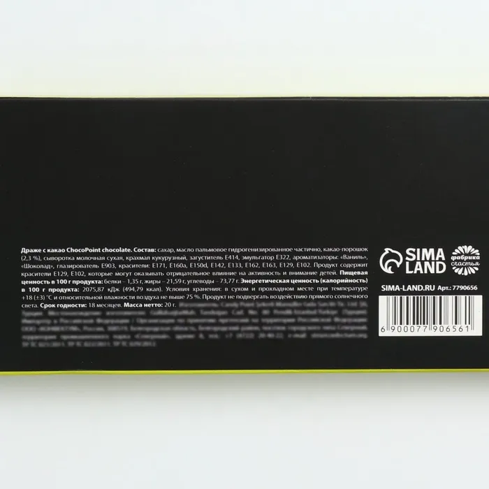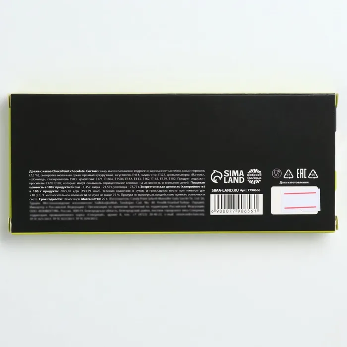 Состав: сахар, масло пальмовое гидрогенизированное частично, какао-порошок (2,3%), сыворотка молочная суха, крахмал кукурузный, загуститель Е414, эмульгатор Е322, ароматизаторы: "Ваниль", "Шоколад", глазирователь Е903, красители: Е171, Е160а, Е150d, Е142, Е133, Е162, Е163, Е129, Е102.