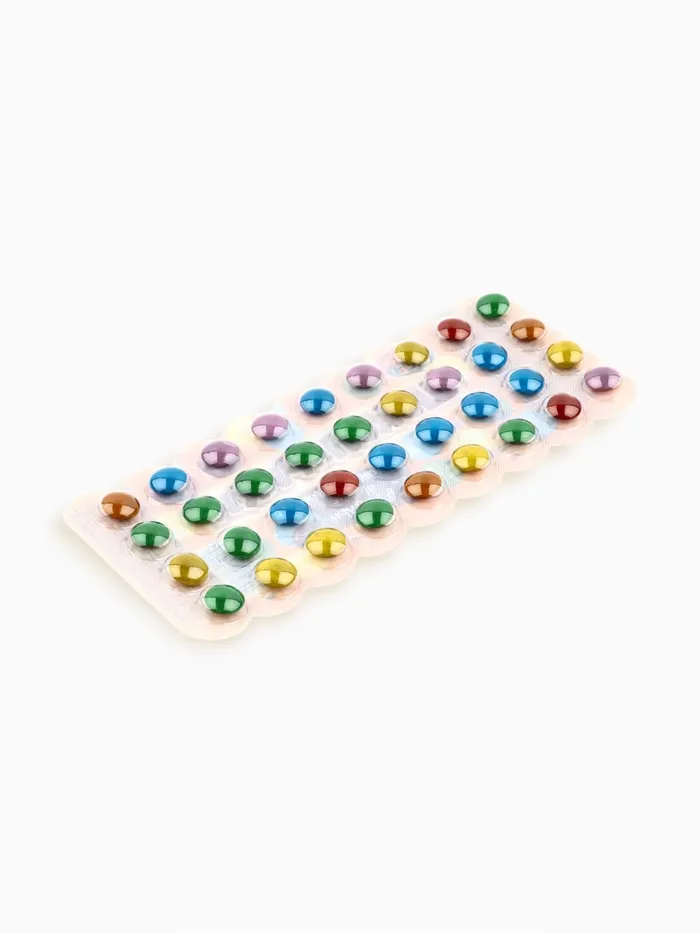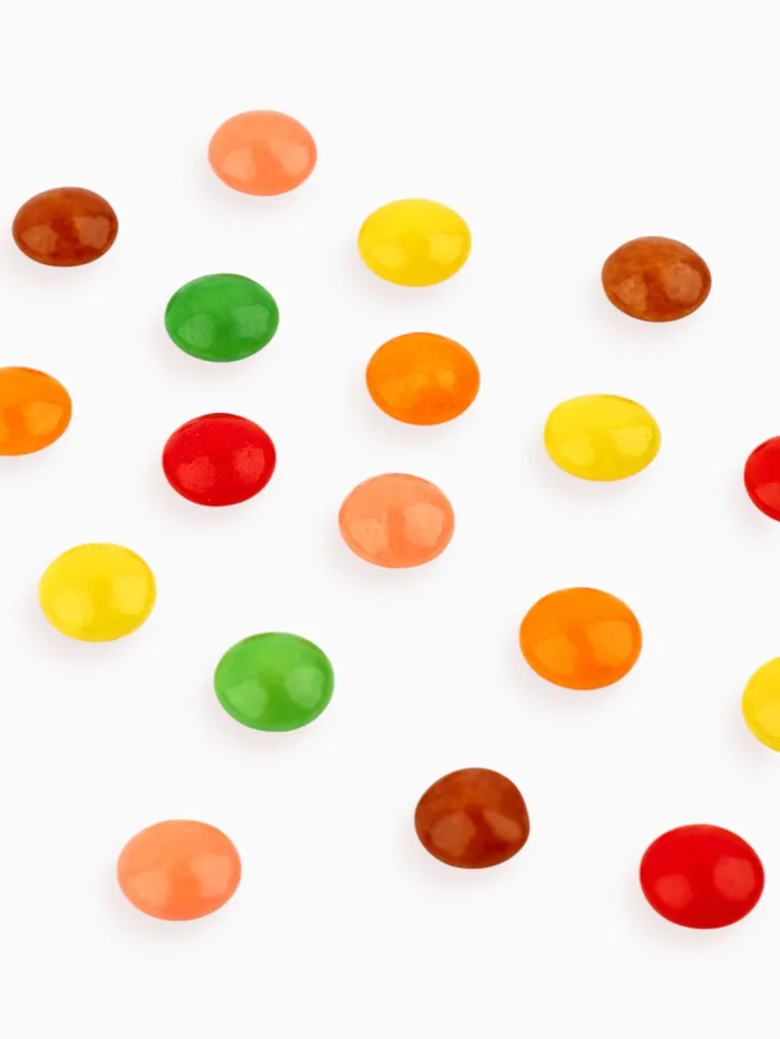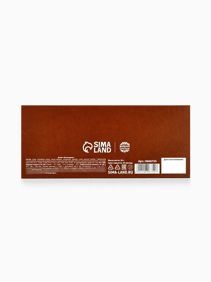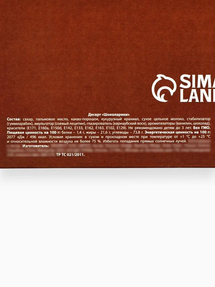 Состав: сахар, пальмовое масло, какао-порошок, кукурузный крахмал, сухое цельное молоко, стабилизатор (гуммиарабик), эмульгатор (соевый лецитин), глазирователь (карнаубский воск), ароматизаторы (ванилин, шоколад), красители (Е171, Е160а, Е150d, Е142, Е133, Е162, Е163, Е102, Е129).