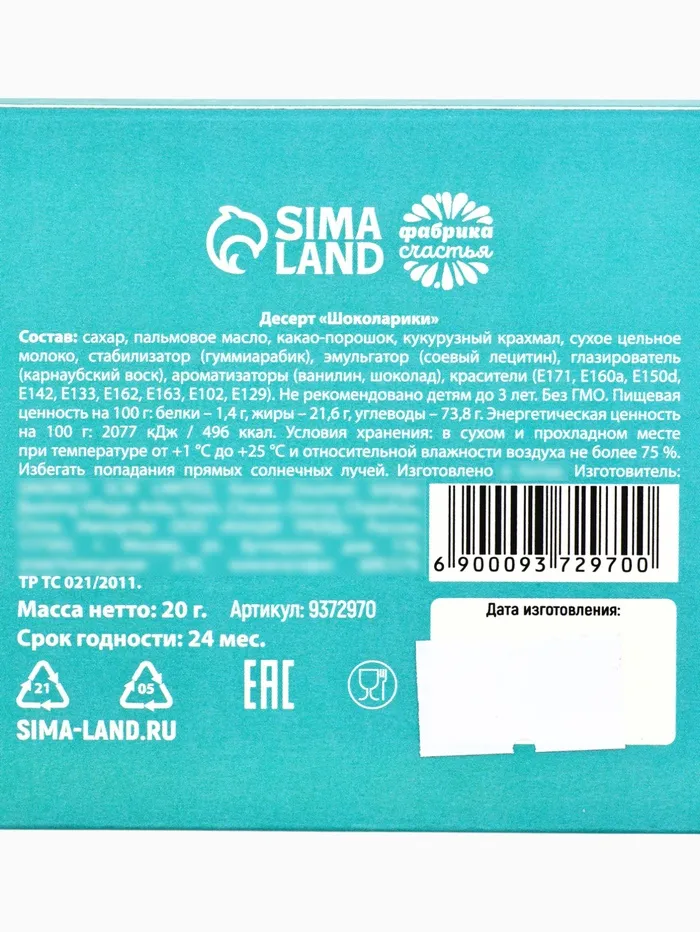 Состав: сахар, пальмовое масло, какао-порошок, кукурузный крахмал, сухое цельное молоко, стабилизатор (гуммиарабик), эмульгатор (соевый лецитин), глазирователь (карнаубский воск), ароматизаторы (ванилин, шоколад), красители (Е171, Е160а, Е150d, Е142, Е133, Е162, Е163, Е102, Е129).