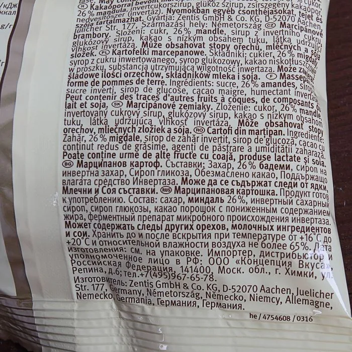 Картошка марципановая Zentis - это традиционное европейское лакомство, приготовленное из отборного миндаля и сахарной пудры. Оно сформовано в виде миниатюрных клубней картофеля и припудрено сверху небольшим количеством темного какао-порошка. Марципан имеет плотную, но мягкую консистенцию, насыщенный миндальный аромат и чистый ореховый вкус. Цельные орехи проходят минимальную переработку, поэтому марципановые продукты сохраняют всю пользу натурального миндаля и считаются одними из самых полезных десертов или сладостей к чаю.