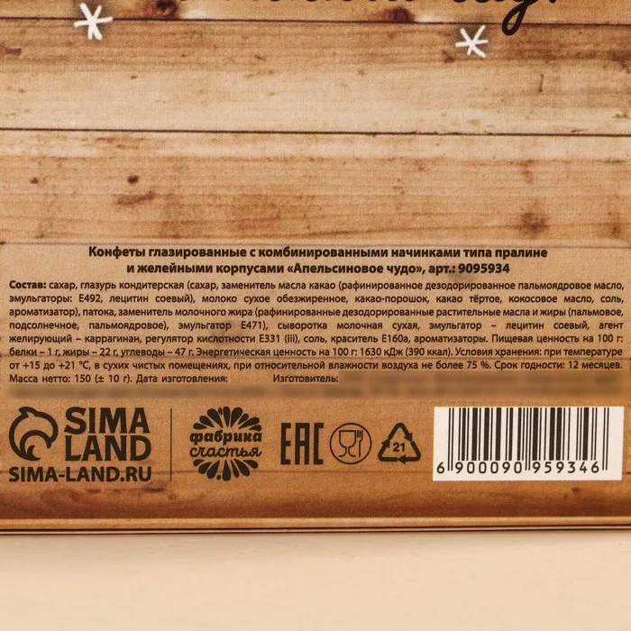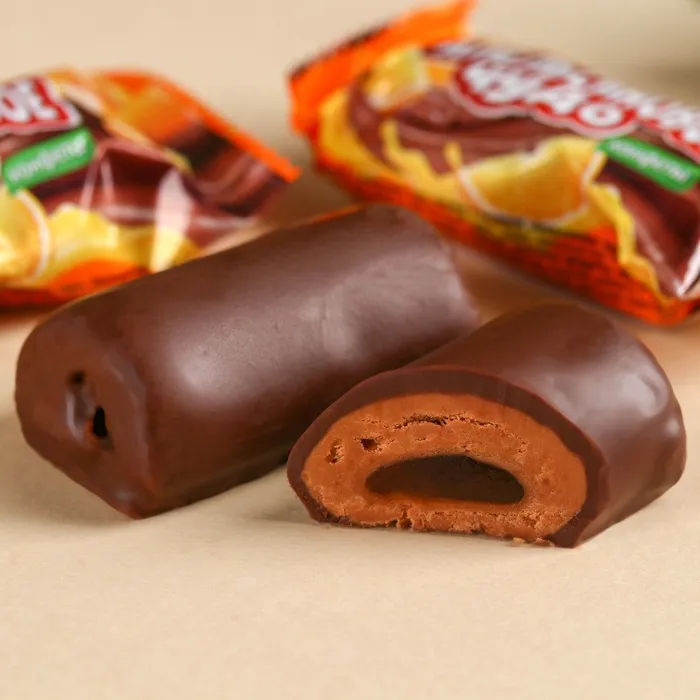 Состав: сахар, глазурь кондитерская (сахар, заменитель масла какао (рафинированное дезодорированное пальмоядровое масло, эмульгаторы: Е492, лецитин соевый), молоко сухое обезжиренное, какао-порошок, какао тёртое, кокосовое масло, соль, ароматизатор), патока, заменитель молочного жира (рафинированные дезодорированные растительные масла и жиры (пальмовое, подсолнечное, пальмоядровое), эмульгатор Е471), сыворотка молочная сухая, эмульгатор – лецитин соевый, агент желирующий – каррагинан, регулятор кислотности Е331 (iii), соль, краситель Е160а, ароматизаторы.