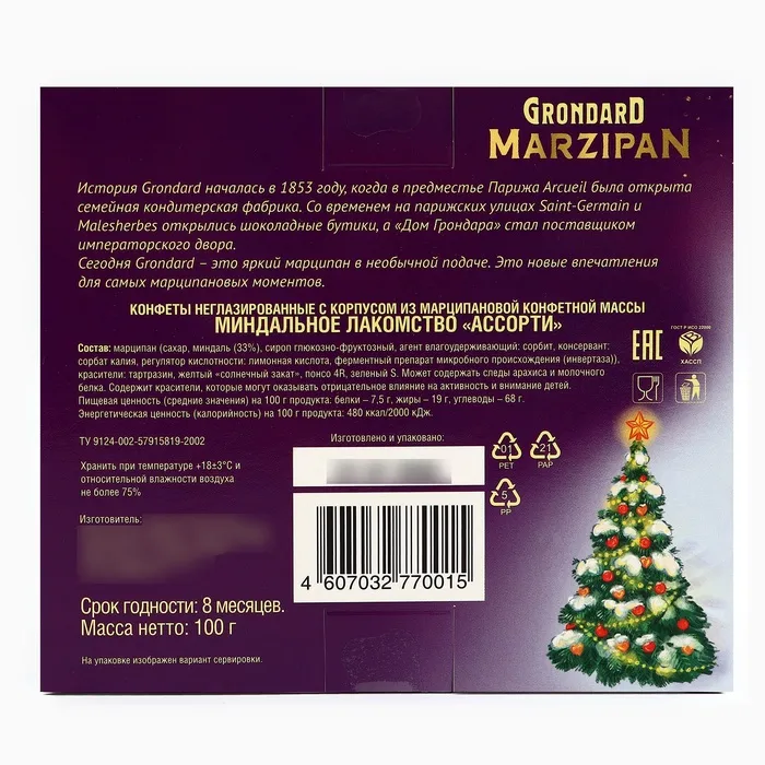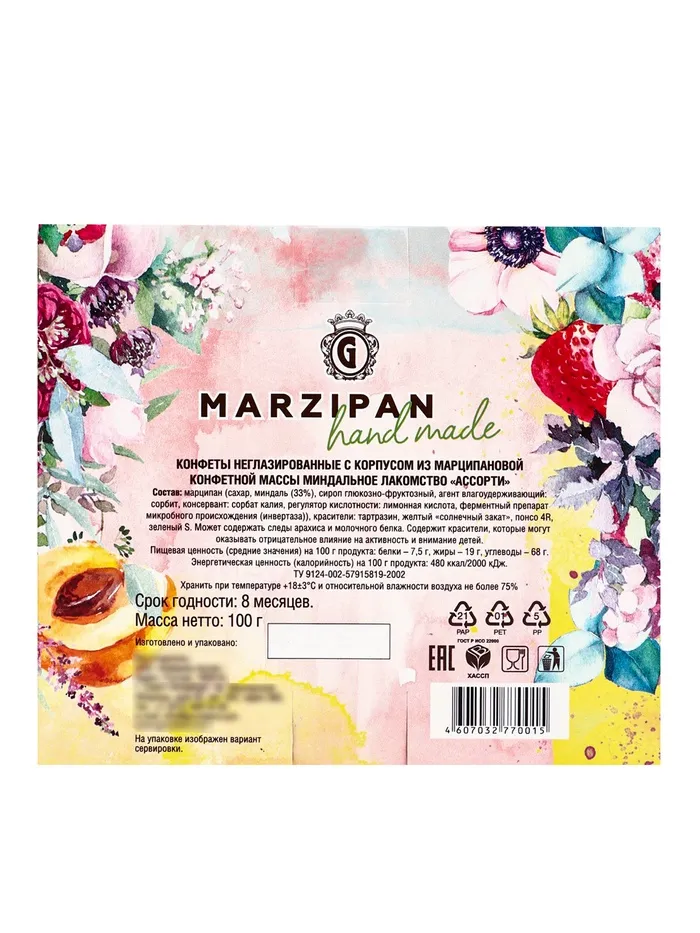 Состав: марципан (сахар, миндаль (33%), глюкозно-фруктозный сироп, влагоудерживающий агент (сорбит), консервант (сорбат калия), регулятор кислотности (лимонная кислота), стабилизатор (ферментный препарат микробного происхождения инвертаза), пищевые красители: кармин, аннато, куркумин, хлорофиллин).