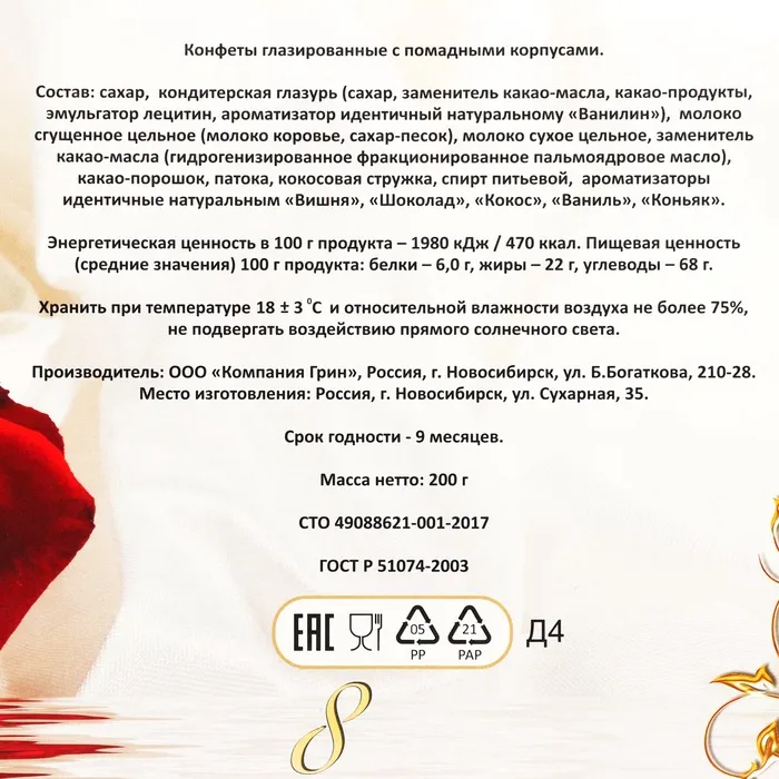 В набор входит 13 глазированных конфет с помадными корпусами.