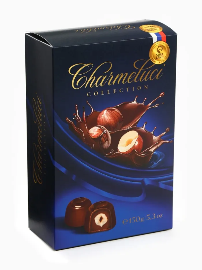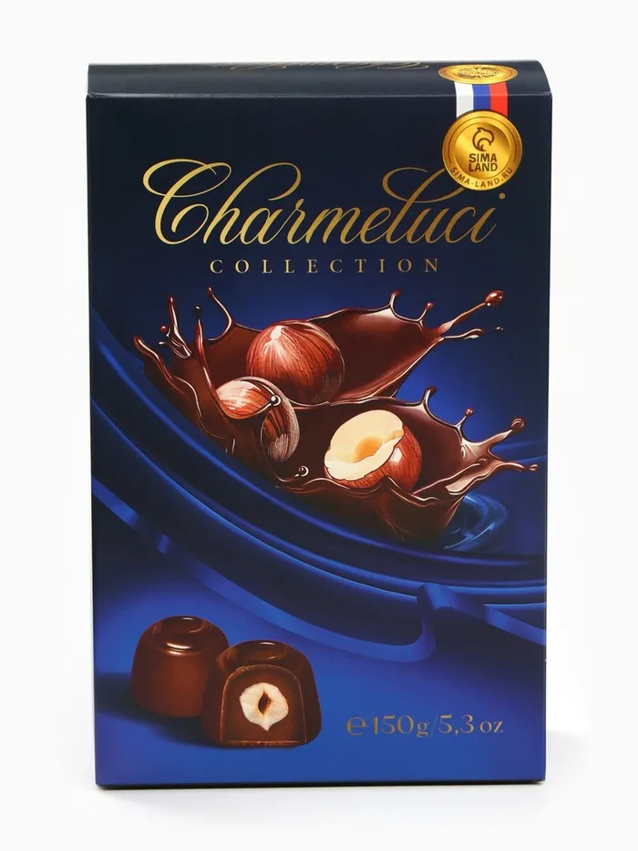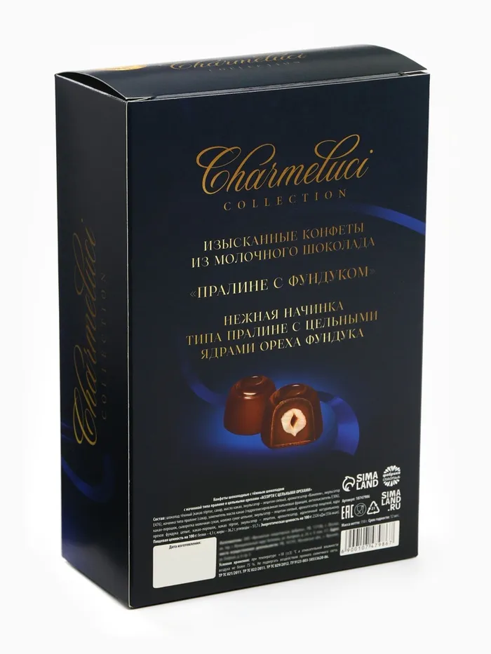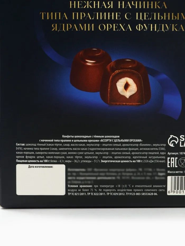 Состав: шоколад тёмный (какао тёртое, сахар, масло какао, эмульгатор – лецитин соевый, ароматизатор «Ванилин», эмульгатор Е476), начинка типа пралине (сахар, заменитель масла какао (гидрогенизированная пальмовая фракция, антиокислитель Е306), какао-порошок, сыворотка молочная сухая, молоко сухое цельное, эмульгатор – лецитин соевый, ароматизатор пищевой, ядра орехов фундука целые, какао-порошок, какао тёртое, эмульгатор – лецитин, ароматизатор, идентичный натуральному.