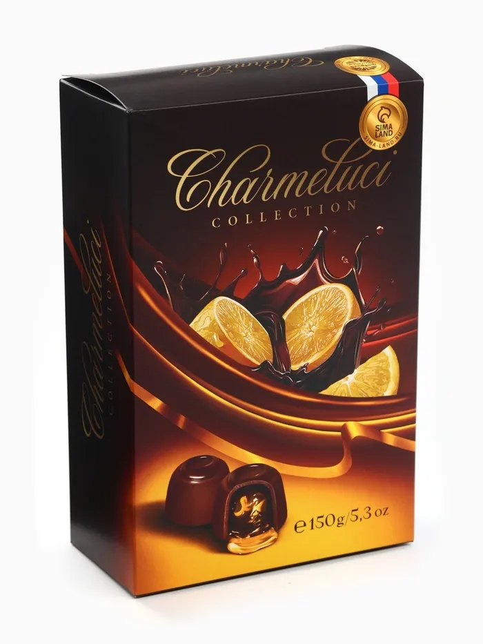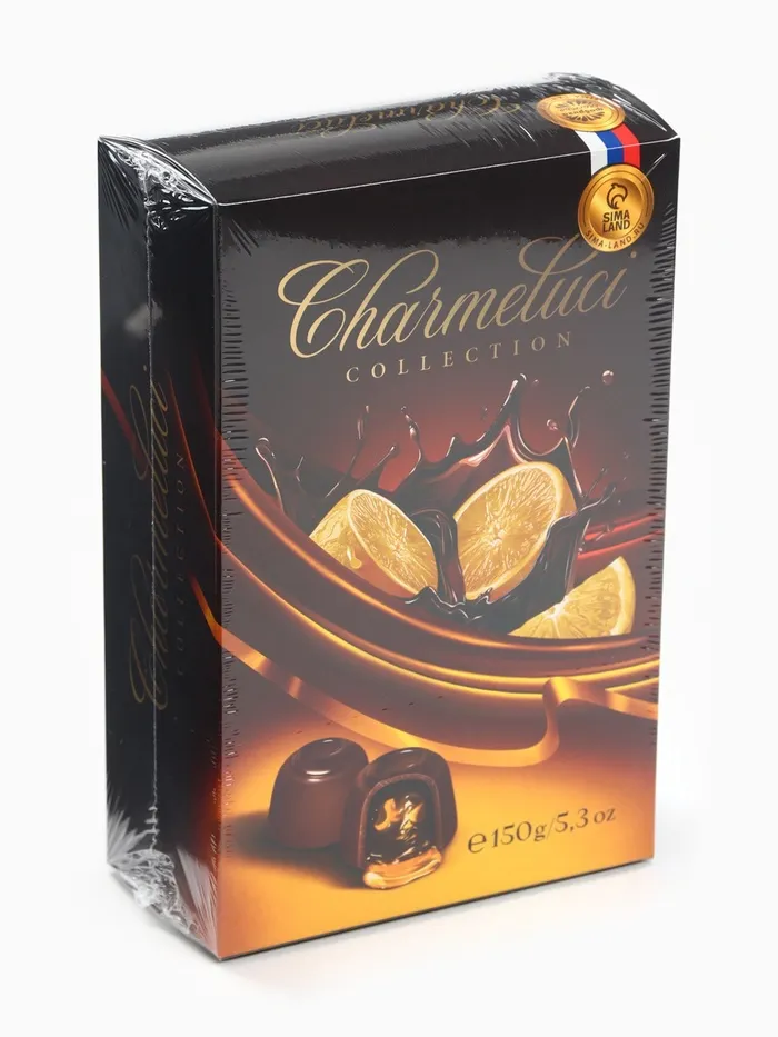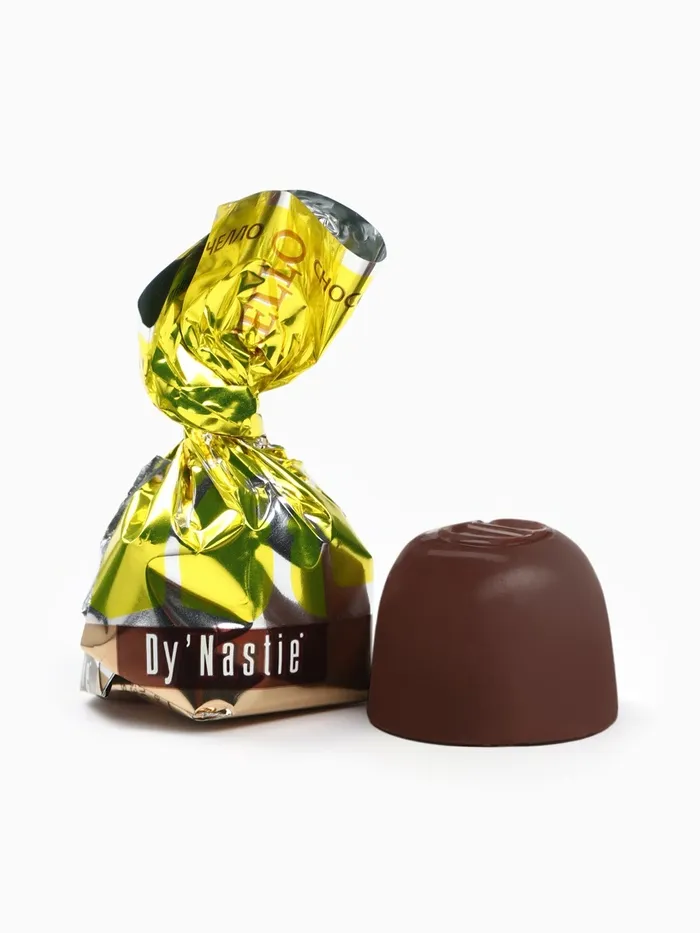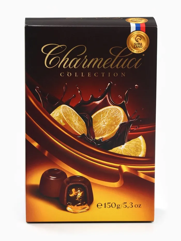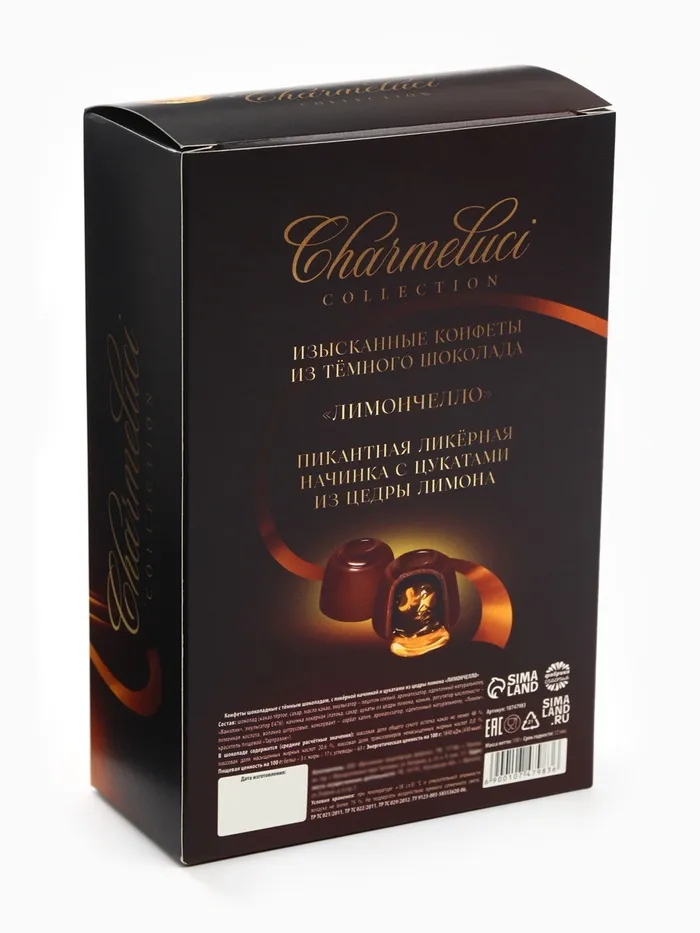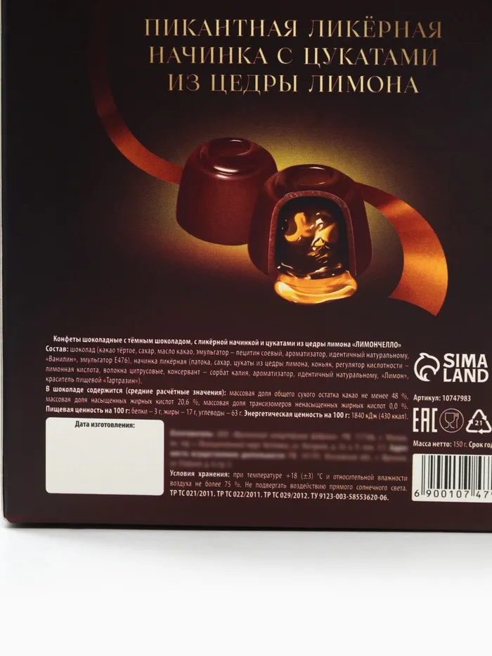 Состав: шоколад (какао тёртое, сахар, масло какао, эмульгатор – лецитин соевый, ароматизатор, идентичный натуральному, «Ванилин», эмульгатор Е476), начинка ликёрная (патока, сахар, цукаты из цедры лимона, коньяк, регулятор кислотности – лимонная кислота, волокна цитрусовые, консервант – сорбат калия, ароматизатор, идентичный натуральному, «Лимон», краситель пищевой «Тартразин»).