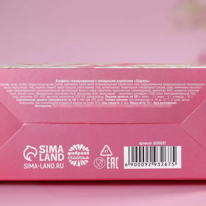Состав: сахар, патока, глазурь кондитерская (сахар, заменитель масла какао нетемперируемый лауринового типа (рафинированное дезодорированное пальмоядровое масло, эмульгаторы: Е492, лецитин соевый), какао-порошок, крупа манная, соль, ароматизатор), кондитерский полуфабрикат (патока, сахар, заменитель молочного жира (рафинированные дезодорированные растительные масла и жиры (пальмовое, подсолнечное, пальмоядровое), эмульгатор Е471), сыворотка молочная сухая, молоко сухое обезжиренное, загуститель Е1422, эмульгатор, агент желирующий – каррагинан, консервант Е202), агент влагоудерживающий Е422, соль, красители: Е171, Е172; регулятор кислотности Е331 (iii), ароматизатор.