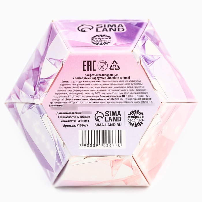 Состав: сахар, глазурь кондитерская (сахар, заменитель масла какао нетемперируемый лауринового типа (рафинированное дезодорированное пальмоядровое масло, эмульгаторы: Е492, лецитин соевый), какао-порошок, крупа манная, соль, ароматизатор) патока, заменитель молочного жира (рафинированные дезодорированные растительные масла и жиры (пальмовое, подсолнечное, пальмоядровое), эмульгатор Е471), загуститель Е1422, соль, агент влагоудерживающий Е422, красители: Е171, Е150d, Е150а; ароматизаторы.