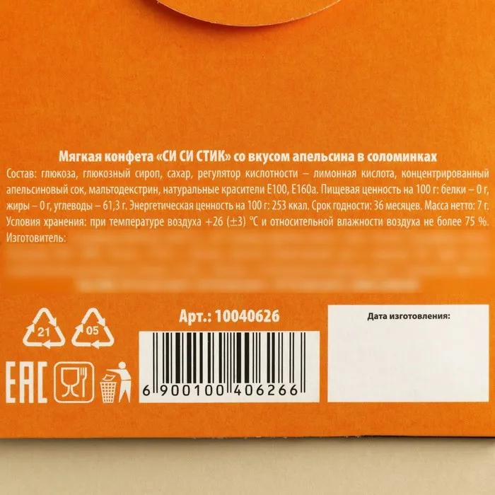 Состав: глюкоза, глюкозный сироп, сахар, регулятор кислотности - лимонная кислота, концентрированный апельсиновый сок, мальтодекстрин, натуральные красители Е100, Е160а.