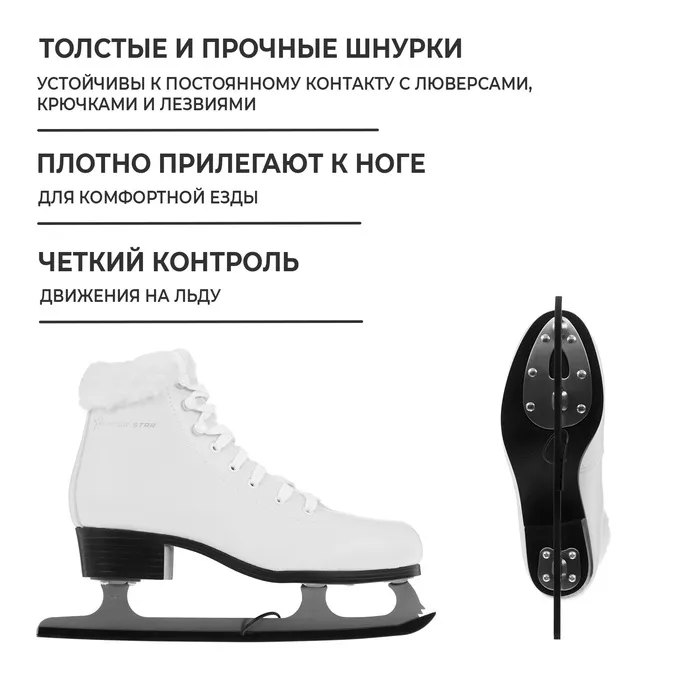 Коньки подходят для фигурного и прогулочного катания. Изготовлены из морозоустойчивой искусственной кожи, подкладки из искусственного меха и нержавеющей стали. Материал подошвы: ПВХ, искусственная кожа. Материал стельки: ЭВА.