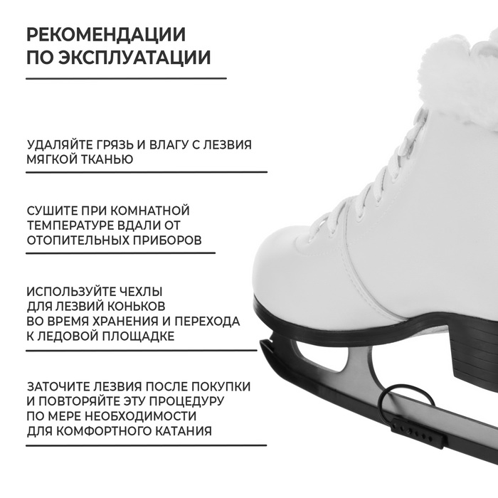 Коньки подходят для фигурного и прогулочного катания. Изготовлены из морозоустойчивой искусственной кожи, подкладки из искусственного меха и нержавеющей стали. Материал подошвы: ПВХ, искусственная кожа. Материал стельки: ЭВА.