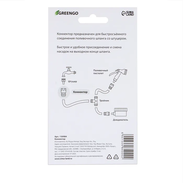 Коннектор предназначен для соединения шланга с пистолетами-разбрызгивателями, кранами, для соединения труб и шлангов между собой. Также может служить в качестве переходника с одного диаметра изделия на другой.