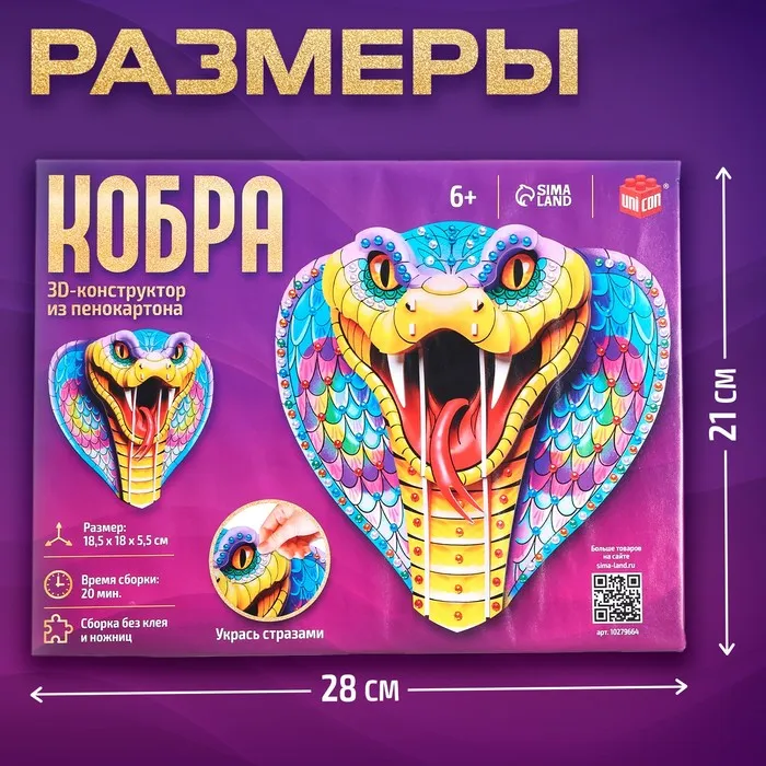 3D конструктор «Кобра» из пенокартона — это увлекательный набор для создания объемной модели, украшенной стразами. Конструктор позволяет собрать кобру, которая станет ярким декором для детской комнаты или оригинальным подарком!