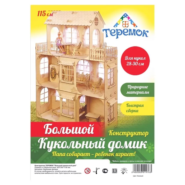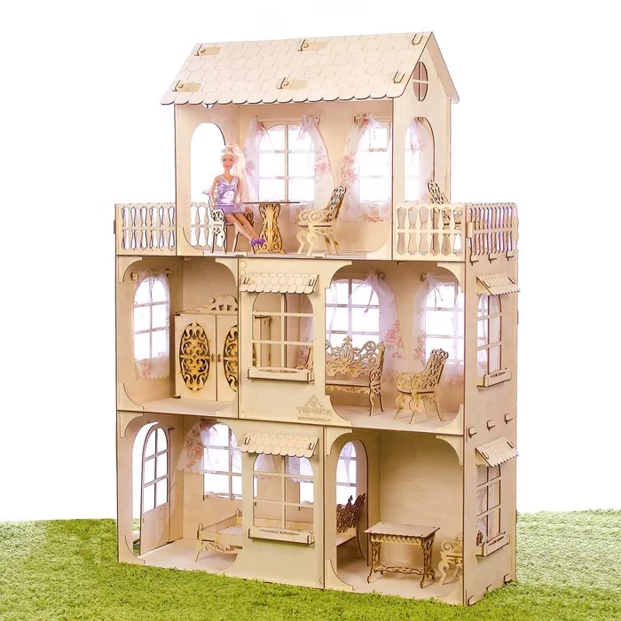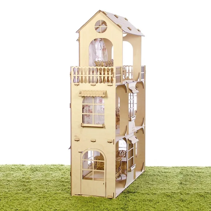 Соберите из деревянного конструктора большой кукольный дом для любимых игрушек! Трёхэтажный дом выглядит очень роскошно: в доме 5 уютных больших комнат и 2 террасы, на каждом окне есть карниз и гардина для штор. С балконов 3 этажа кукольные жители смогут любоваться окрестностями.