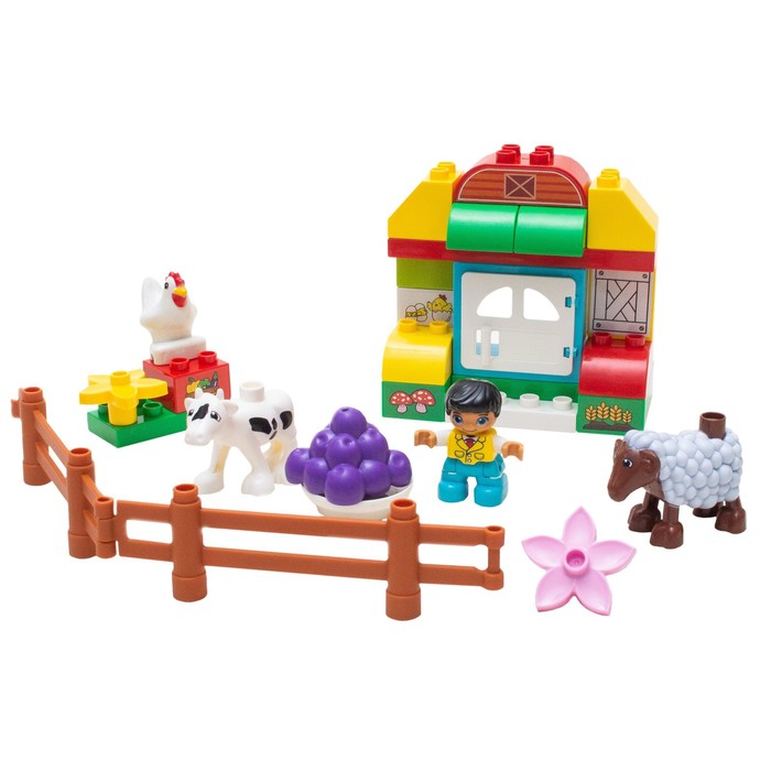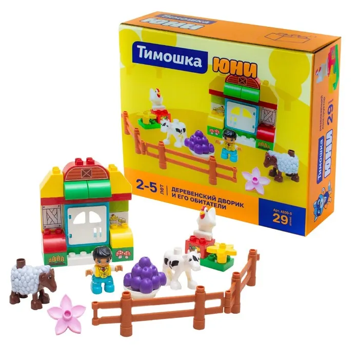 - Комплект для начала игры — 29 элементов: в набор входят блоки для постройки домика, фигурки животных и дополнительные аксессуары. Ребёнок может собрать сцену из сельской жизни за несколько минут.