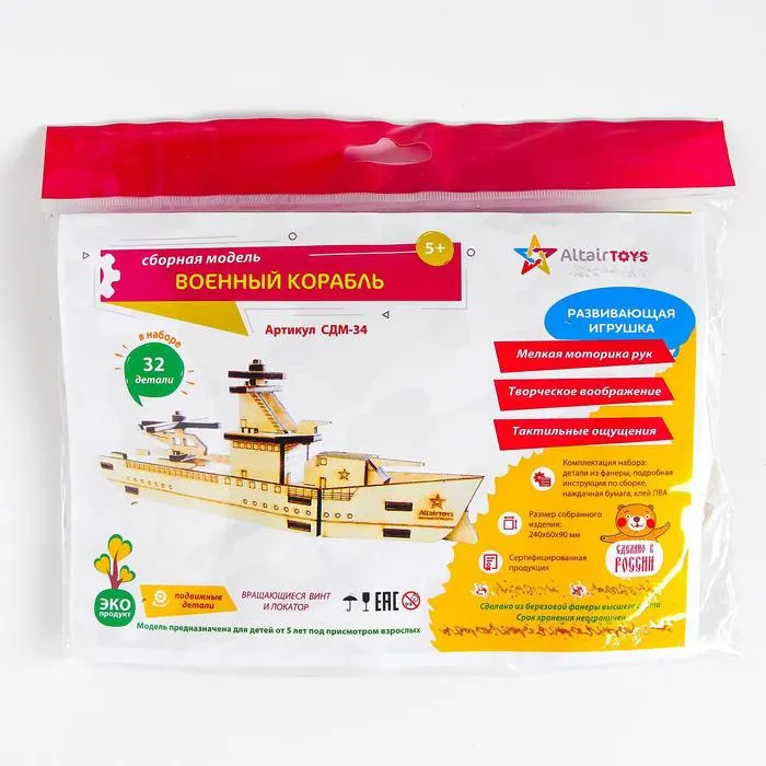 Сборная модель военного корабля — отличный вариант досуга, который разовьёт у ребёнка множество навыков. Склеивайте детали между собой согласно инструкции. При желании раскрасьте игрушку и покройте лаком. После сборки и высыхания клея моделью можно играть.
