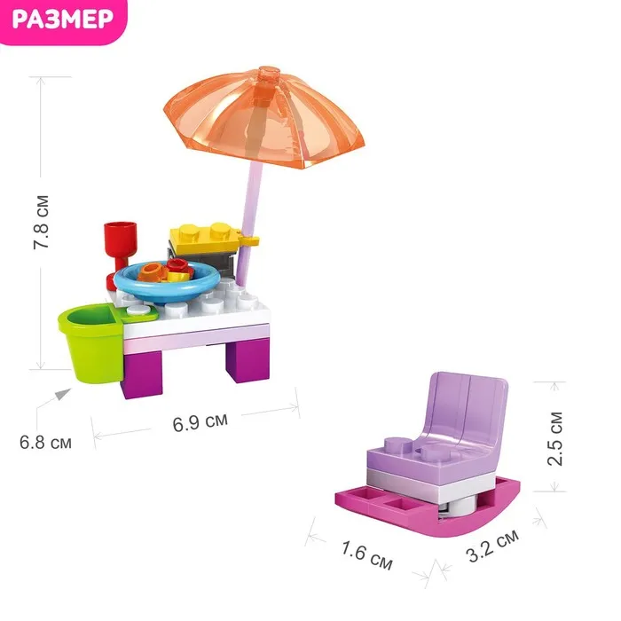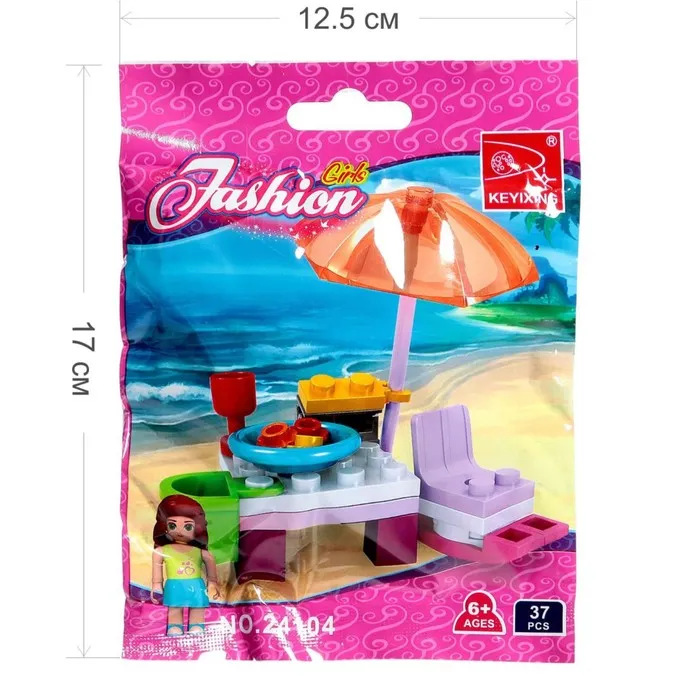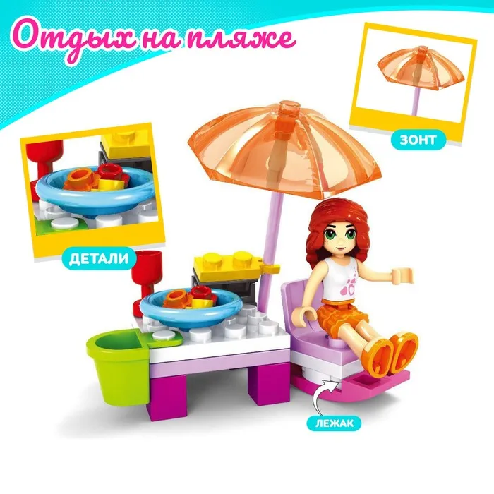 Набор содержит 31 деталь и позволяет сконструировать фигурку девочки, пляжный столик и лежак. Разнообразные красочные элементы пробудят воображение ребёнка — дочурка придумает множество ярких сюжетов и с удовольствием проведёт время.
