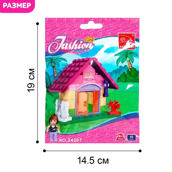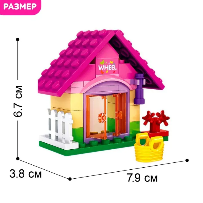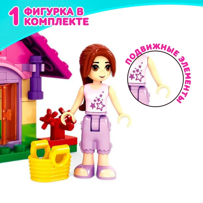 Набор содержит 44 детали и позволяет сконструировать дачный коттедж, аксессуары и фигурку девочки.