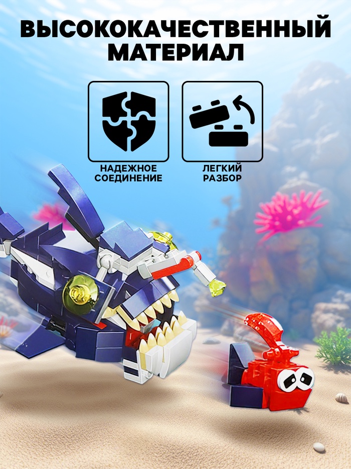 Сборка конструктора помогает развить творческое мышление, мелкую моторику и логику, а также знакомит детей с морскими животными и экосистемой океана. Играя, дети смогут создавать свои уникальные истории о жизни под водой, что способствует их интеллектуальному и эмоциональному развитию.