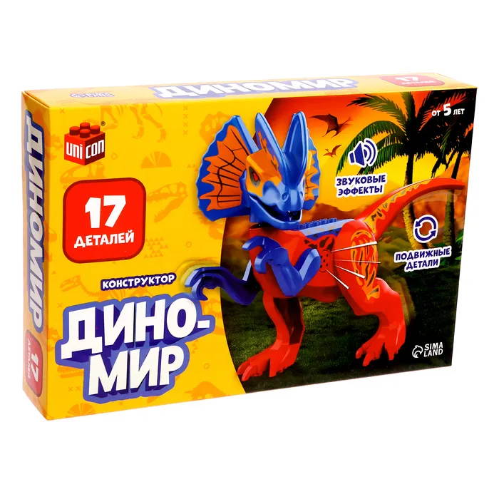 С конструктором «Диномир» ребёнок соберёт подвижную модель динозавра со звуковыми эффектами и окунётся в захватывающий мир доисторических гигантов!