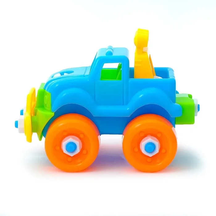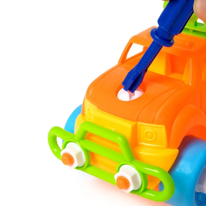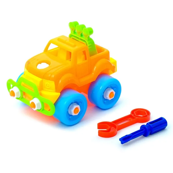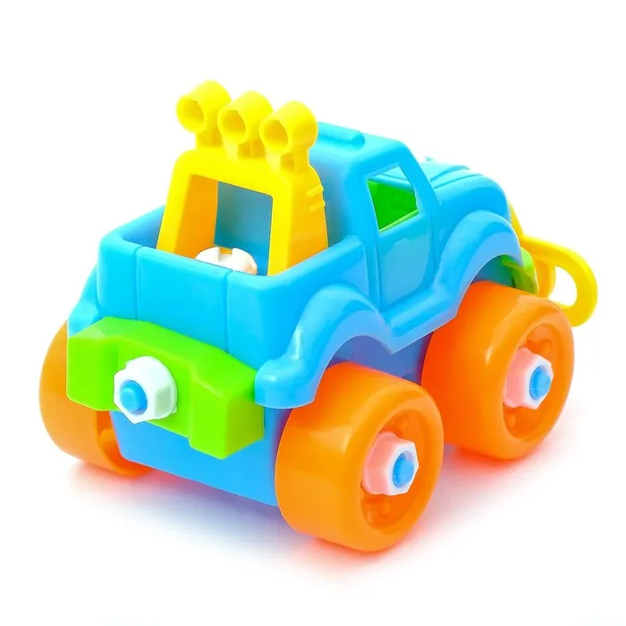 - Простая сборка: крупные детали с винтовым соединением легко скручиваются даже маленькими руками. Малыш сможет собрать джип без помощи взрослых.