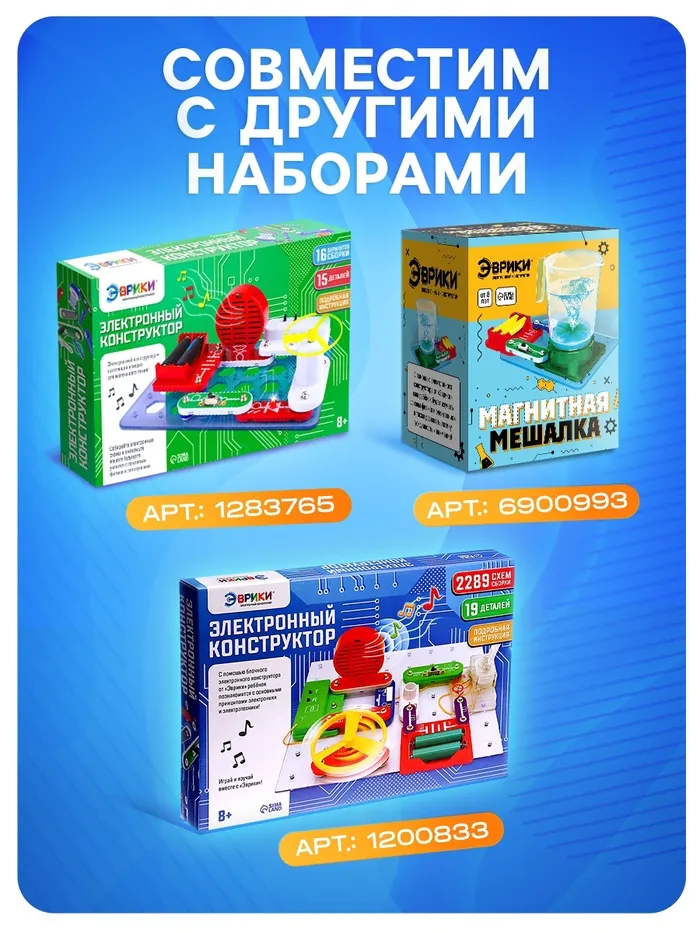 Экспериментируйте и создавайте электрические устройства самостоятельно. В наборах вы найдёте подробную инструкцию с описанием каждого шага. Конструктор «Эврики» предназначен для сборки различных простых электронных схем. Соединение элементов между собой производится с помощью специальных кнопочных креплений — это удобно, легко и быстро. Собранные схемы не требуют настройки и начинают работать сразу.