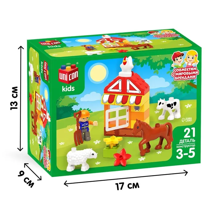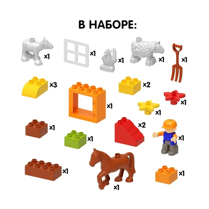 - В наборе 21 деталь разных форм и размеров. Из них можно собрать весь сюжет, изображённый на коробке.