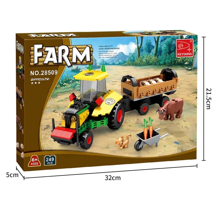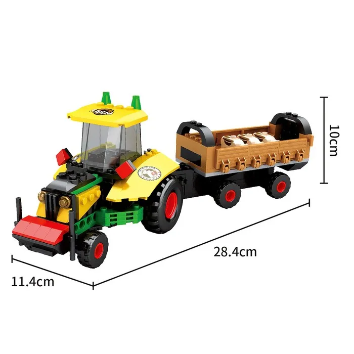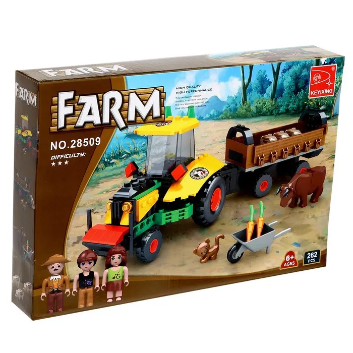 - Функциональный трактор с прицепом: Дети соберут детализированную модель трактора с телегой, которая может перевозить грузы. Подвижные элементы делают игру реалистичной и увлекательной.