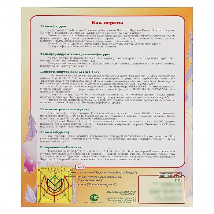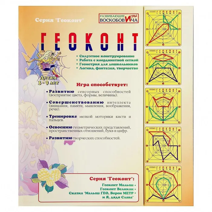 Игра "Геоконт" развивает сенсорику, мелкую моторику, логику, фантазию, учит силуэтному конструированию, совершенствует интеллект и развивает творческие и логические способности ребенка. Согласно определенным заданиям, ребенок натягивает резинки на гвоздики так, что создает предметные силуэты, геометрические фигуры, узоры, цифры, буквы - по образцу, словесному алгоритму и собственному замыслу.