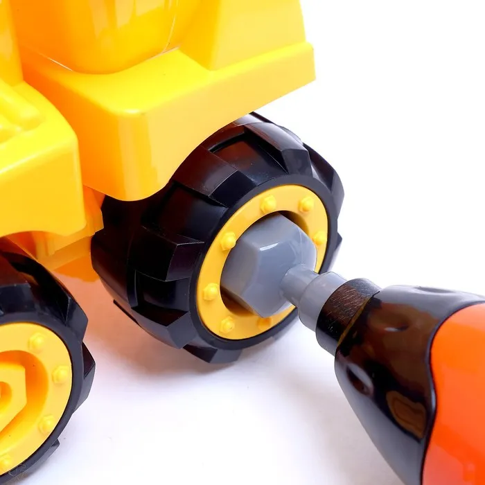 Для сборки техники в комплект входит отвёртка и шуруповёрт. Выберете подходящий инструмент и соединяйте детали друг с другом, следуя указаниям инструкции. Готовый «Грузовик» украсьте наклейками и приступайте к строительству мегаполиса.