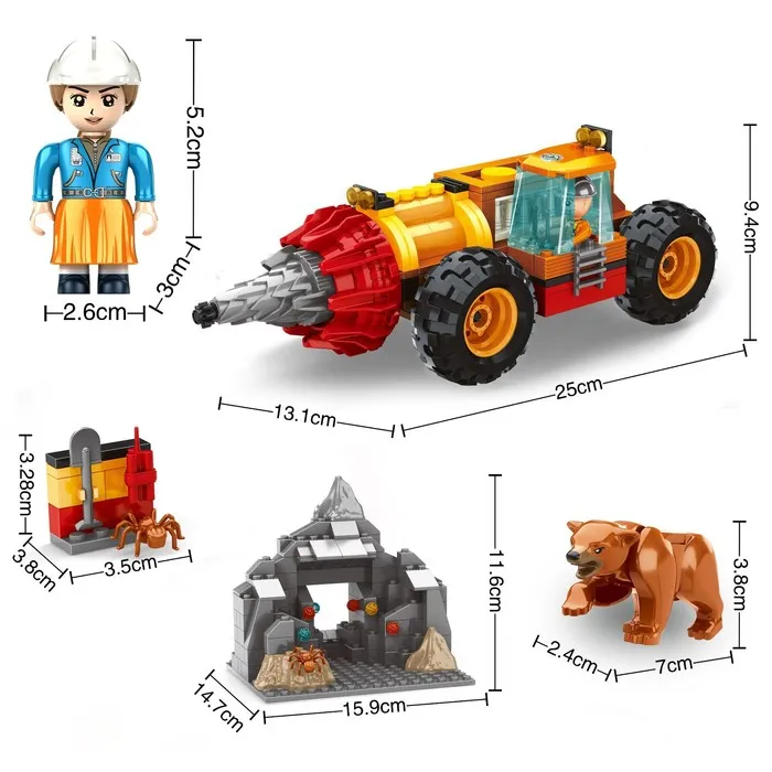 - Фигурки и дикие животные: Набор включает фигурку шахтёра в защитном шлеме, а также фигурки медведя и паука, создающие дополнительные сюжетные линии для игры.