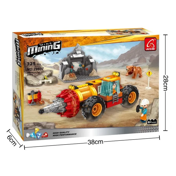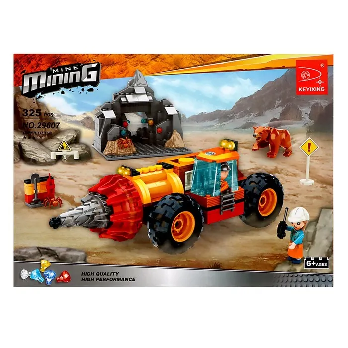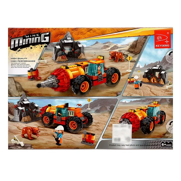 - Буровой вездеход с вращающимся буром: Дети соберут детализированную машину с массивным буром на передней части, большими колёсами для передвижения по неровной местности и просторной кабиной пилота.