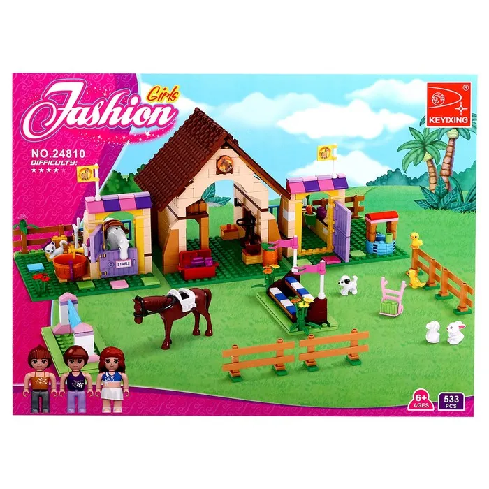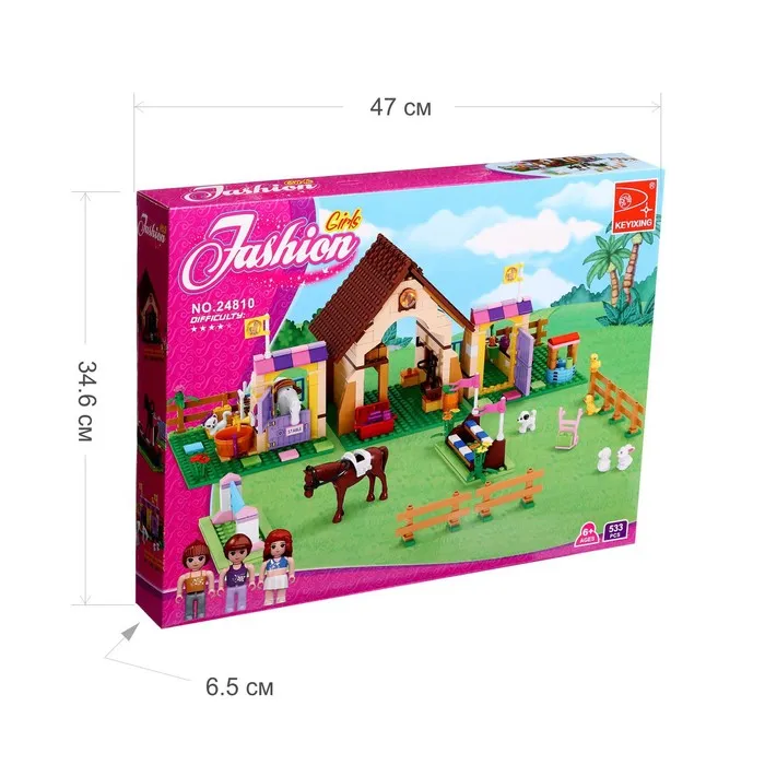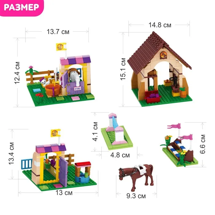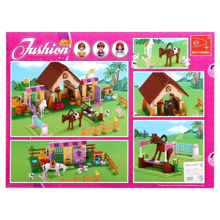 Набор содержит 517 деталей и позволяет сконструировать вольеры для лошадей, поильники, клумбы и защитные ограждения. Маленькая фантазёрка будет тренировать животных и заботится о них.