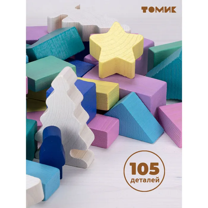 - Набор включает 105 элементов, представляющих собой различные геометрические фигуры для создания разнообразных конструкций.